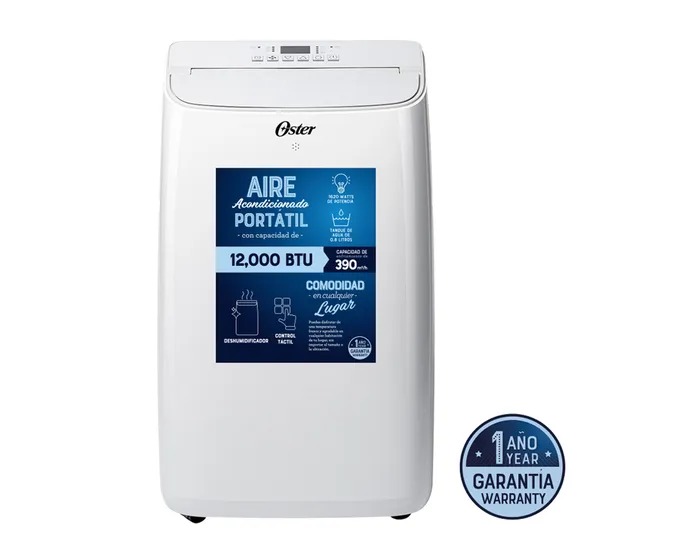 El Aire Acondicionado Portátil OSTER PACPOR1210FWE es un equipo de climatización de capacidad media, diseñado para enfriar eficazmente habitaciones de tamaño estándar (típicamente hasta $mathbf{20},mathbf{m^2}$). Ofrece una capacidad de enfriamiento de 12,000 BTU/h y un diseño 3 en 1 que incluye las funciones de Enfriamiento, Deshumidificación y Ventilación, proporcionando confort en diversas condiciones climáticas. Su formato portátil con ruedas y kit de ventana fácil de instalar lo hace ideal para quienes buscan una solución de aire acondicionado sin instalación permanente.