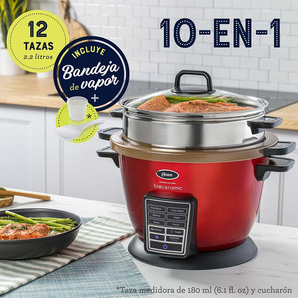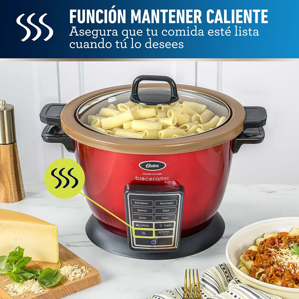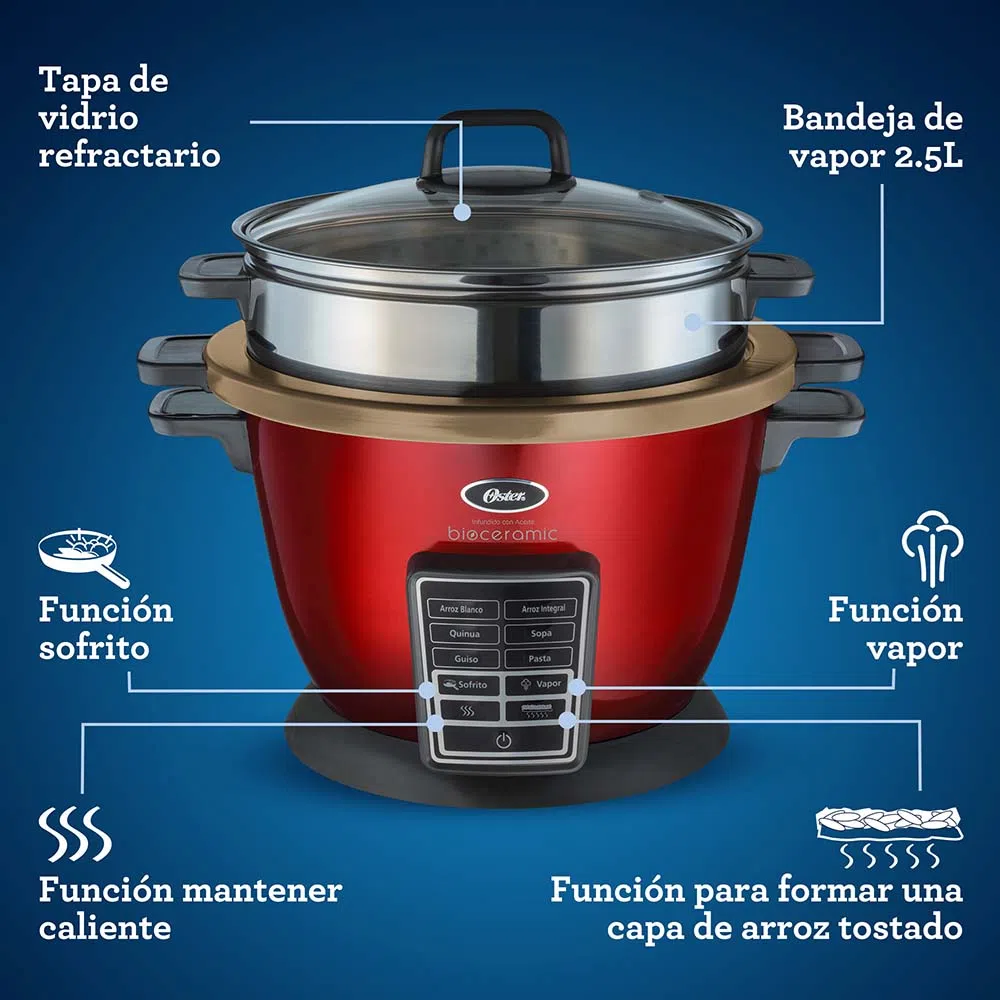 La Olla Arrocera Multifunción Oster® CKSTRC9030R es mucho más que una arrocera: es una solución práctica y versátil para preparar comidas completas con el mejor sabor y textura. Con una capacidad ideal para toda la familia, permite cocinar arroz, sopas, guisos, verduras al vapor y mucho más con total facilidad.