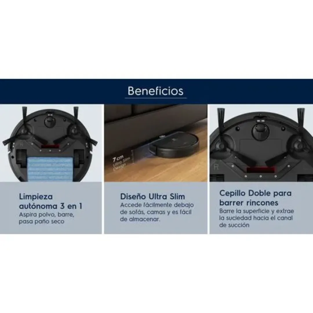 Su sistema 3 en 1 mantiene tus pisos al día: sus dos cepillos laterales barren la suciedad de las esquinas hacia el centro, su boquilla de succión aspira polvo y pelos, y su función de Mopa Seca (paño de microfibra incluido) atrapa el polvo fino restante para un acabado más pulido. Además, incluye un Filtro HEPA Allergy Protect que retiene ácaros y alérgenos, y sensores inteligentes anticaída que evitan que se vaya por las escaleras.
