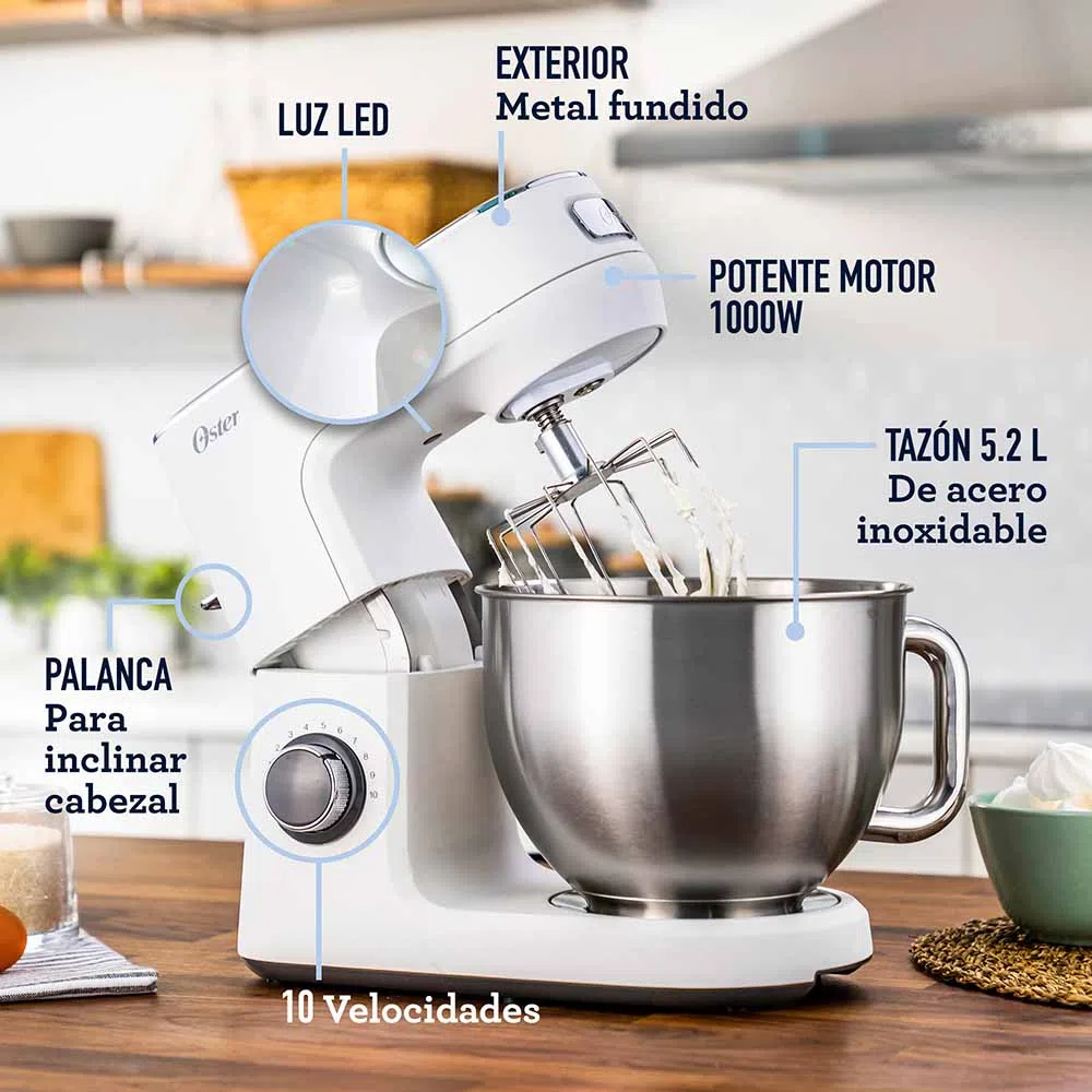 Con la batidora planetaria Oster® haces múltiples docenas de galletas en una sola preparación gracias a su potente rendimiento y tazón de gran capacidad. Su acción planetaria te brinda un mezclado homogéneo y la luz LED del cabezal una mejor visibilidad. Sus 10 velocidades te permiten preparar todo tipo de mezclas. ¡Y su color blanco siempre combina con tu cocina!