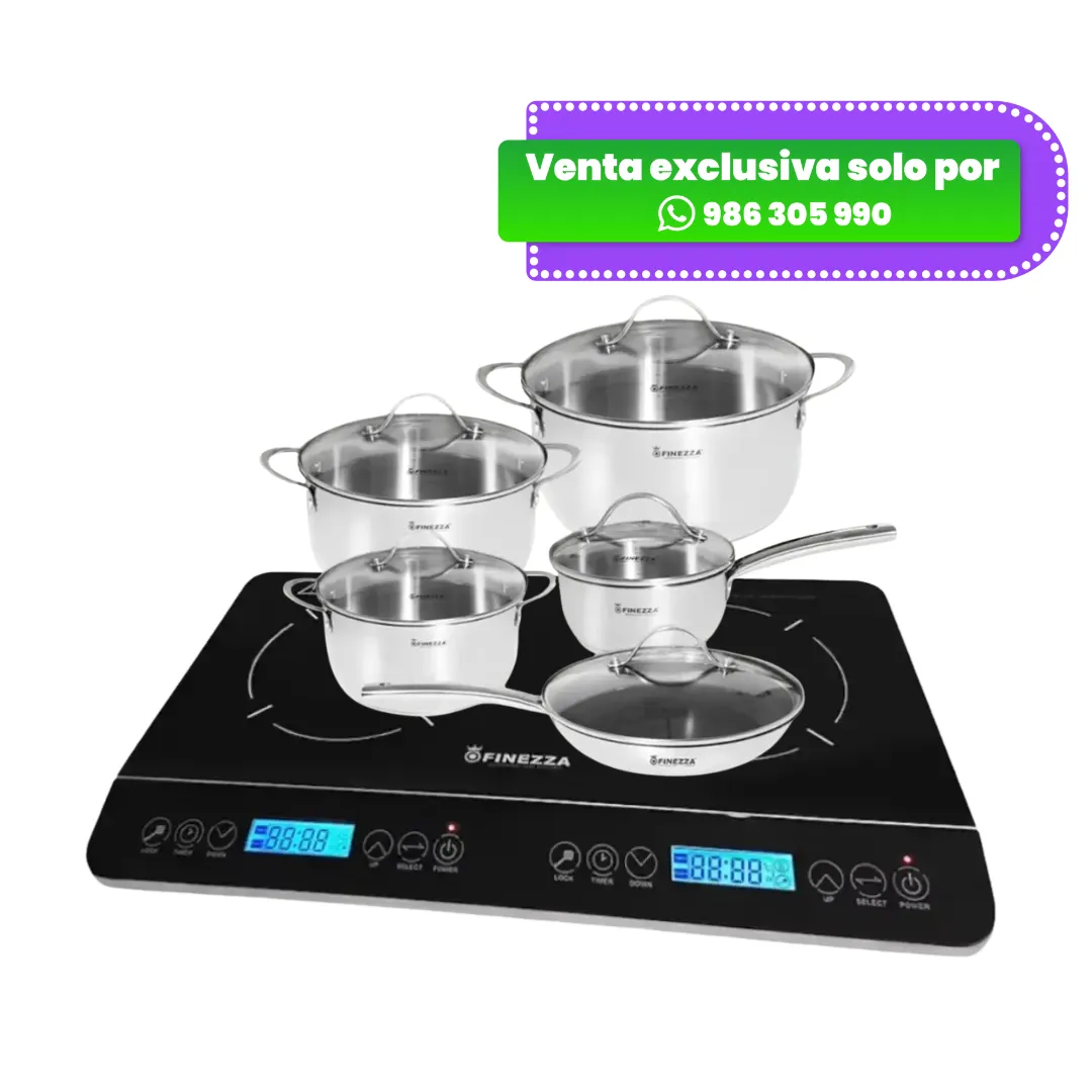 Equipa tu cocina con el Combo de Cocina de Inducción de 2 Hornillas + Juego de Ollas de Acero Inoxidable de 10 Piezas, la combinación perfecta de eficiencia, elegancia y practicidad. La cocina de inducción ofrece un calentamiento rápido y uniforme, con controles táctiles y niveles de potencia ajustables, ideales para cocinar de forma segura y moderna.