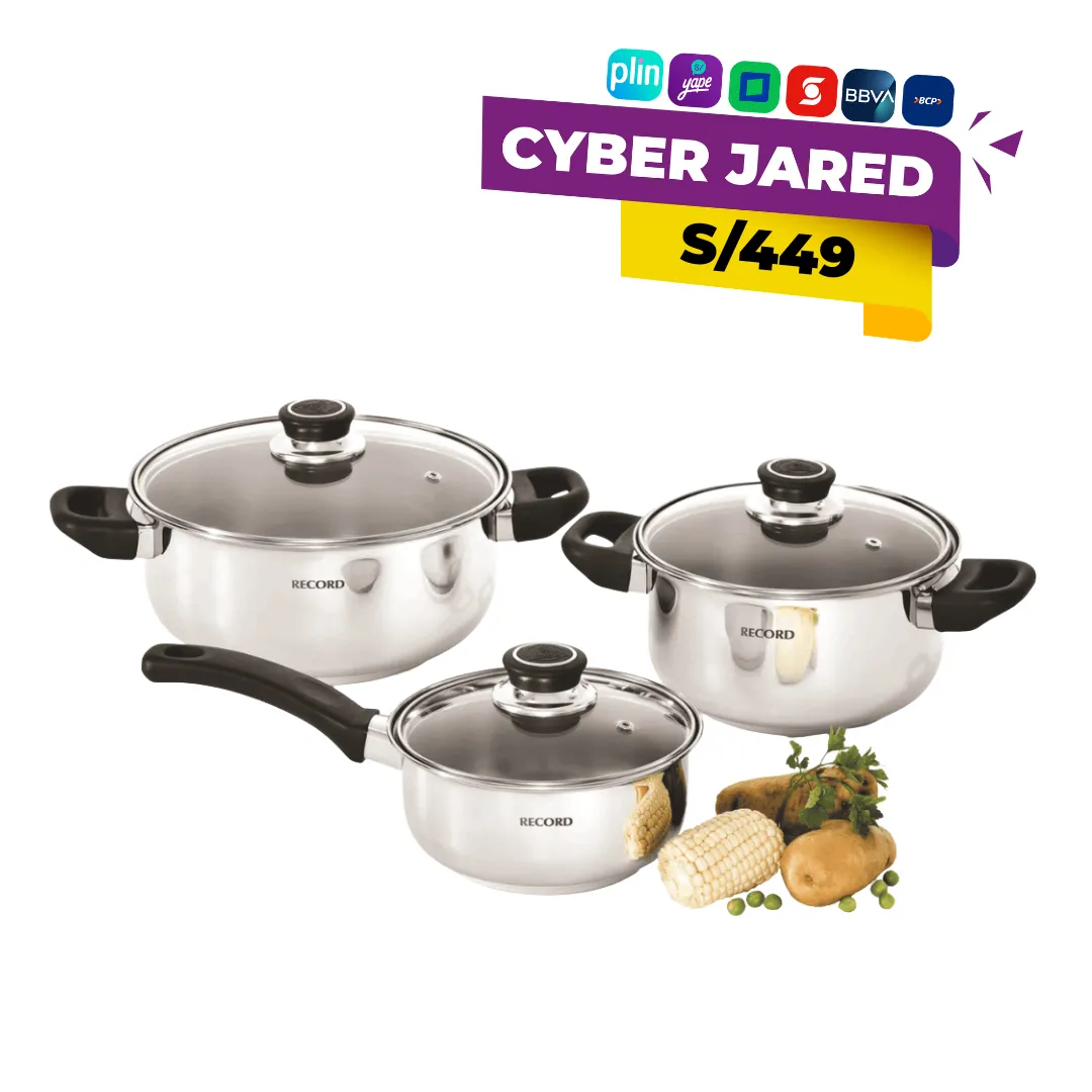 El Juego de Ollas Record Encanto es un set de cocina básico y elegante, compuesto por 6 piezas fabricadas en Acero Inoxidable de alta calidad. Este material es la elección ideal para la cocina gracias a su durabilidad, resistencia a la corrosión y facilidad de limpieza, además de ser higiénico y no reaccionar con los alimentos. El set generalmente incluye tres ollas de distintos tamaños con sus respectivas tres tapas de vidrio templado, conformando el total de seis piezas.