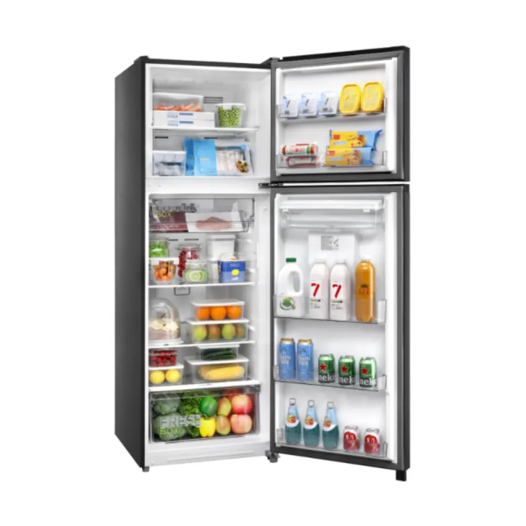 Para garantizar un ambiente saludable, incorpora la tecnología Active C-Fresh, un filtro de carbono que neutraliza olores y prolonga la frescura de frutas y vegetales. Su diseño de dos puertas (Top Mount) destaca por un acabado moderno en acero negro resistente, con una manija integrada y un dispensador de agua de fácil acceso. Con una robusta garantía de 10 años en el compresor, esta refrigeradora es la inversión perfecta para quienes buscan gran capacidad, durabilidad y el respaldo de una marca líder global.