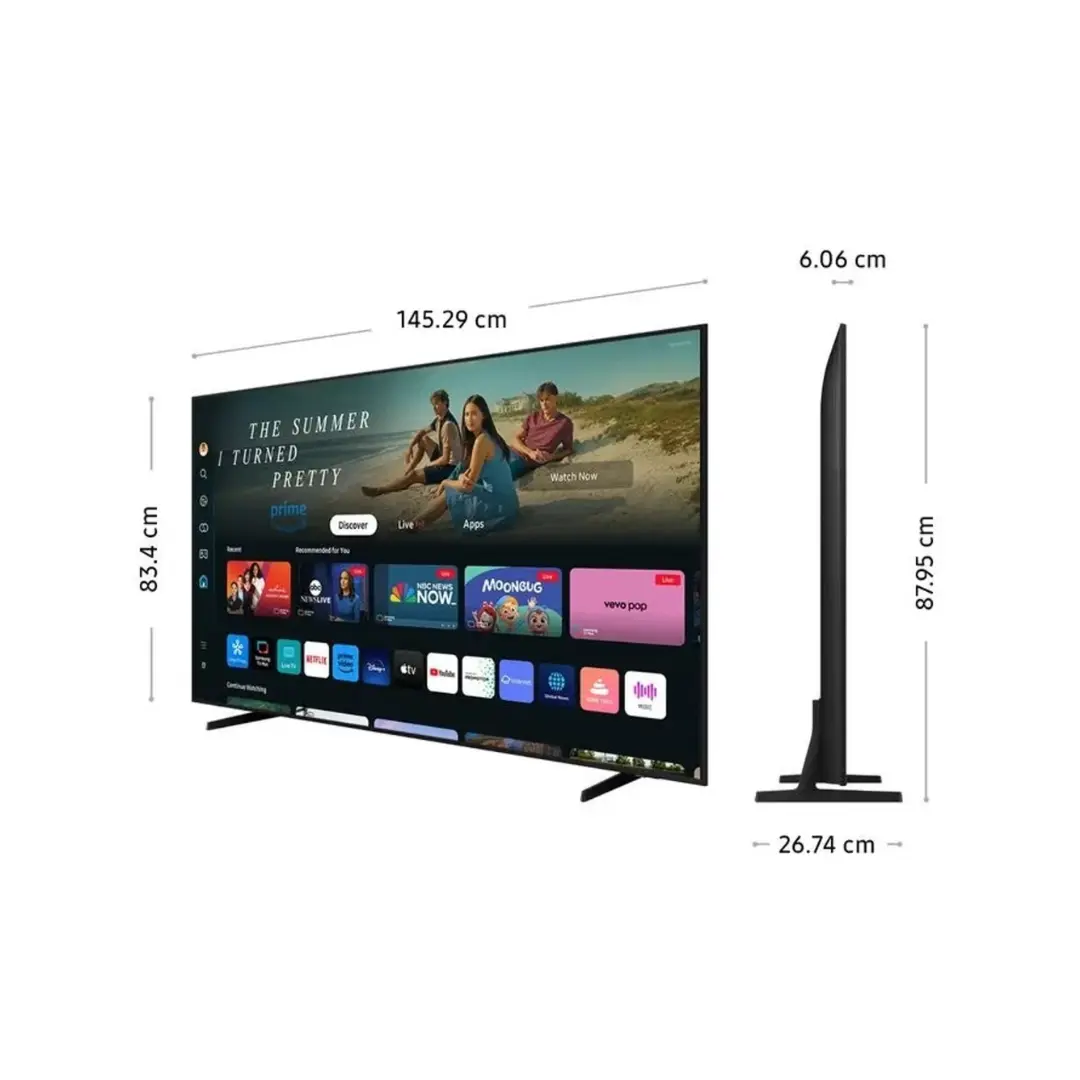 Este televisor opera bajo el Sistema Operativo Tizen™, proporcionando una plataforma Smart TV rápida e intuitiva para acceder a las principales aplicaciones de streaming (Netflix, Disney+, etc.). El diseño es generalmente de biseles delgados (Slim Design), lo que maximiza la pantalla para una mejor inmersión. En términos de conectividad, cuenta con varios puertos HDMI y USB, y ofrece soporte para HDR y funciones de Smart Home a través de SmartThings, convirtiéndolo en un centro de entretenimiento eficiente para el hogar.